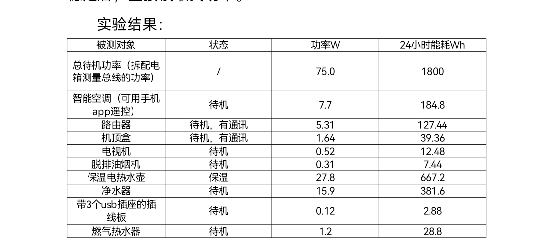 如果看懂以上实验结果?技术人员对一户居民家的空调、电视、路由器、机顶盒在待机或通电未使用状况下的耗电情况进行了测量,并通过配电箱测出了该居民家的总待机功率为75瓦,24小时的耗电量为1.8度。